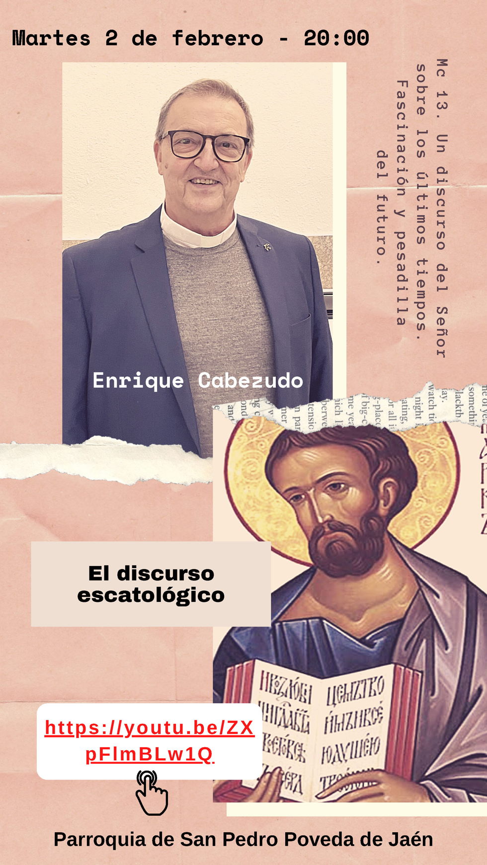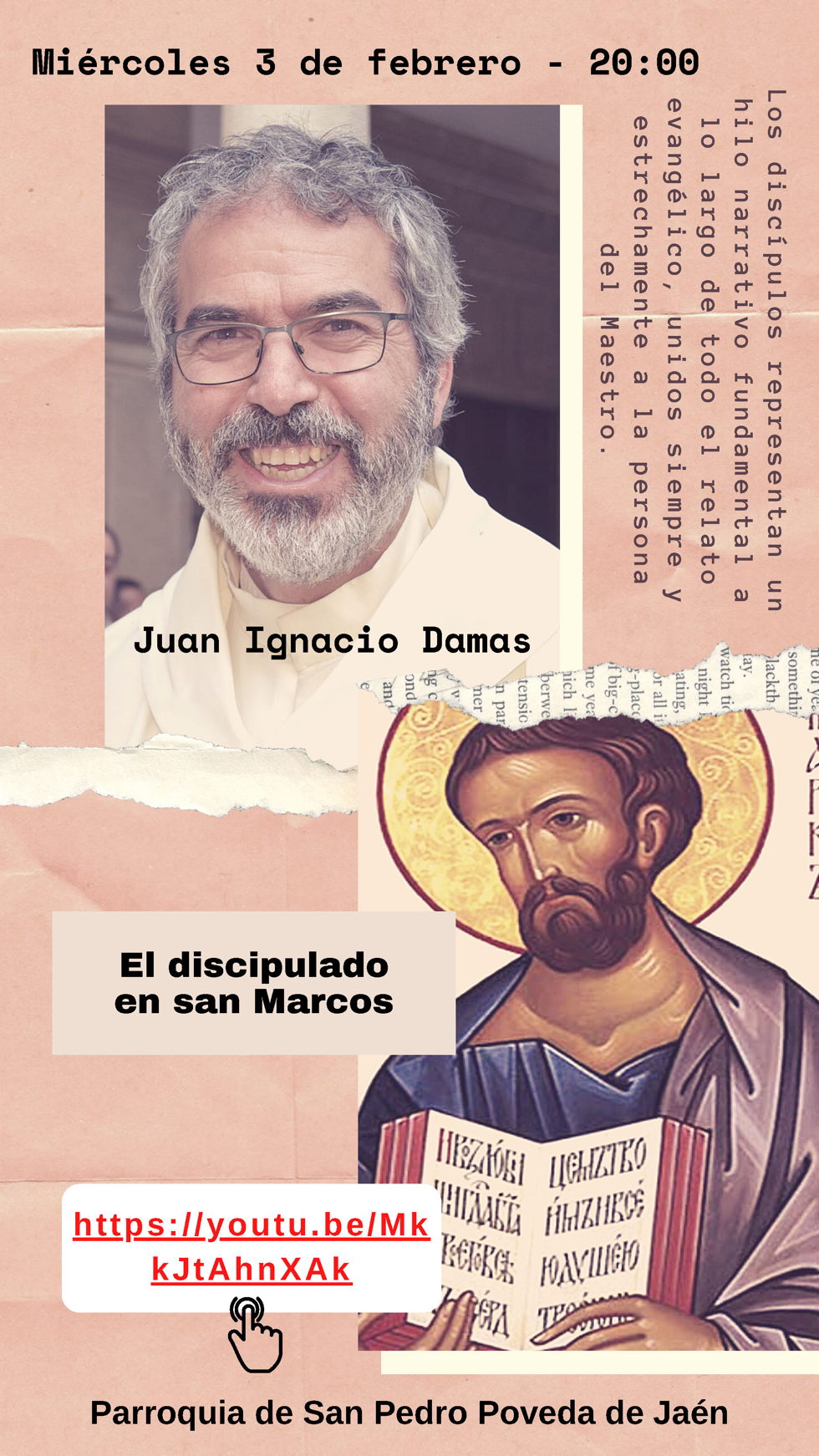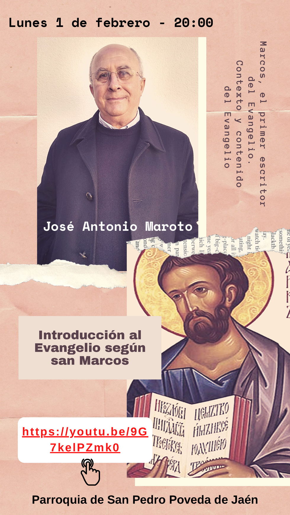 El pasado 24 de enero de 2021 (tercer domingo del tiempo ordinario) hemos celebrado el Domingo del Palabra de Dios. Con ese motivo los dos Arciprestazgos de la ciudad de Jaén, el departamento de Sagrada Escritura del Seminario de Jaén y el Instituto de Ciencias Religiosas de la Universidad de San Dámaso (extensión de Jaén) han organizado para la primera semana de febrero un ciclo de conferencias sobre el Evangelio de san Marcos, el evangelio que nos acompañará todo el año 2021.