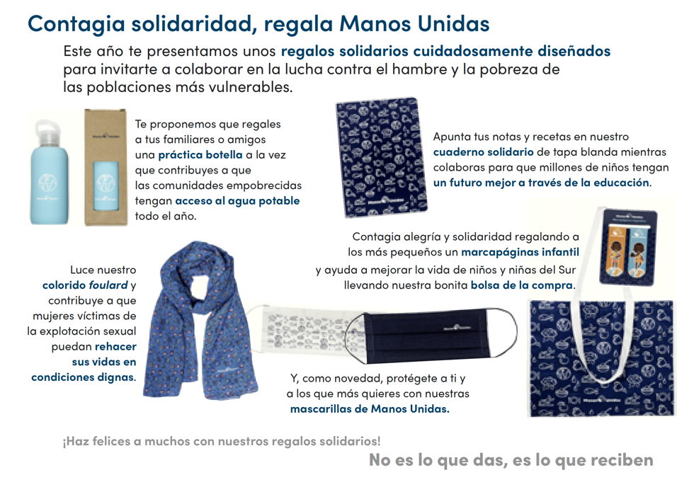 Los domingos 7 y 14 de febrero, después de las misas de 11.30 y 12.30, tendremos la tienda solidaria de Manos Unidas en la que podrás llevarte productos exclusivos de Manos Unidas y dar tu aportación para la campaña 2021.