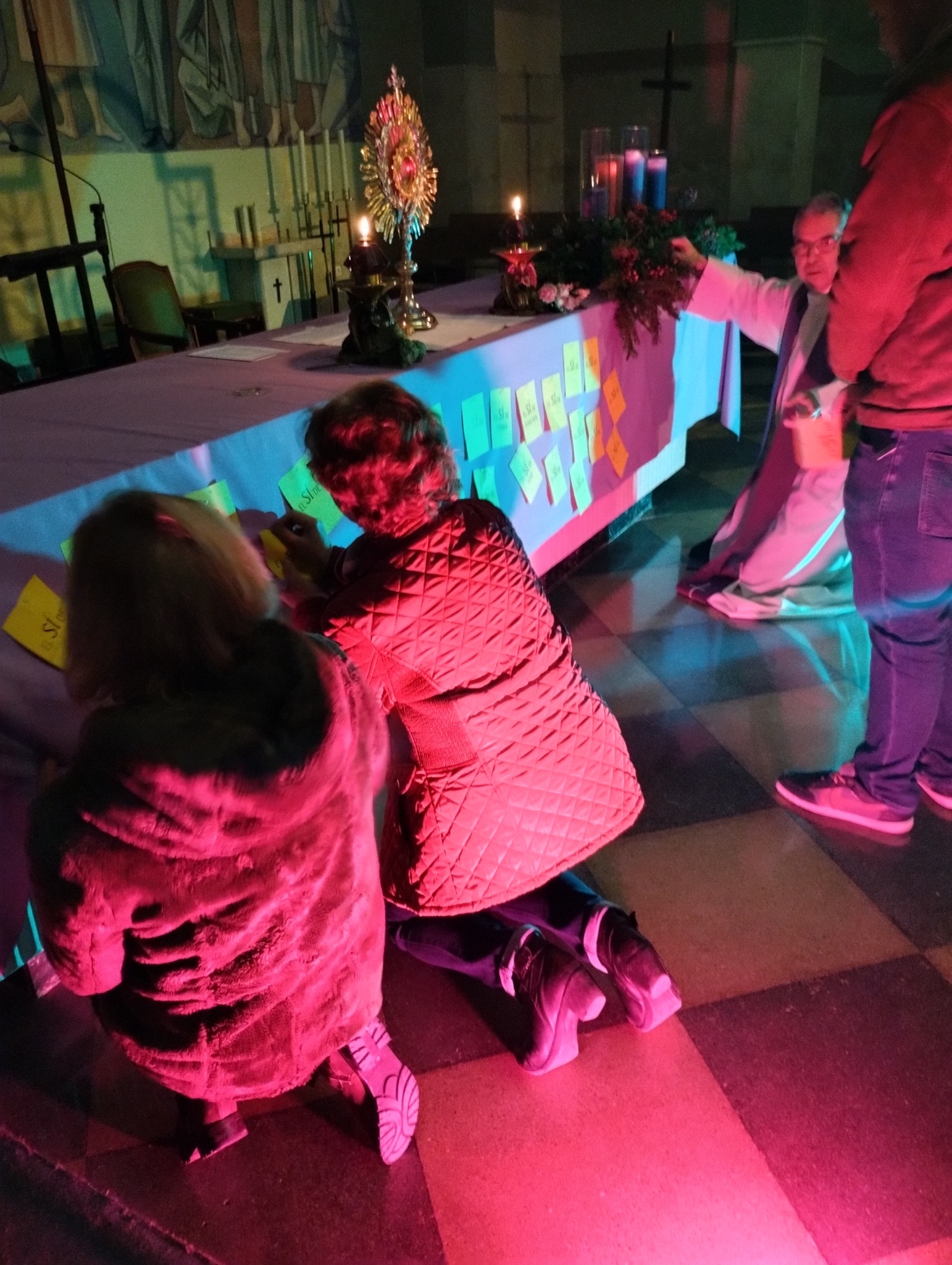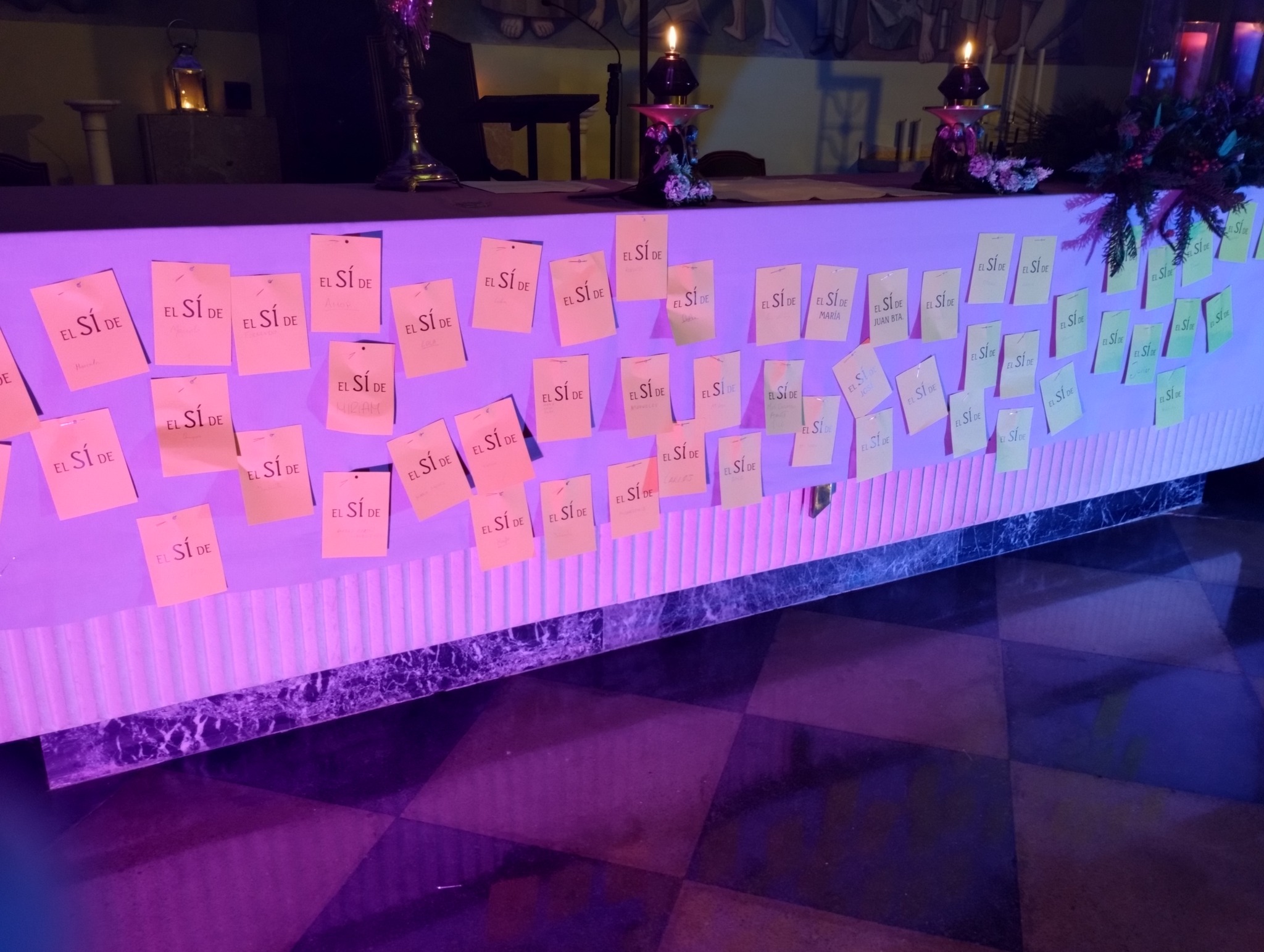 Este último Encuentro lo iniciamos con una Vigilia prenavideña centrada en el “Sí”. Tras reflexionar sobre ese Sí dado por José, Juan Bautista y María, cada uno de los asistentes pudo entregar su particular “Sí” al que le lleva estás fechas en las que celebramos la siempre nueva venida de Jesús. Los Sí de cada uno fueron colocados a los pies del Santísimo durante el tiempo que estuvo expuesto. Toda la Vigilia fue acompañada por el canto y la música de nuestro músico católico local José Ibáñez.