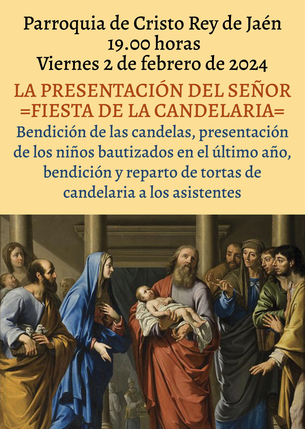 Desde antiguo, las familias cristianas se acostumbraron a presentar en la iglesia a sus hijos este día, como María presentó a Jesús. La comunidad parroquial de Cristo Rey invita a todos los esposos cristianos que tienen niños pequeños a que los traigan ese día a la iglesia, para presentarlos al Señor e invocar sobre ellos su bendición. Y de manera especial están invitadas las familias que han bautizado a sus hijos durante el año que pasó.
